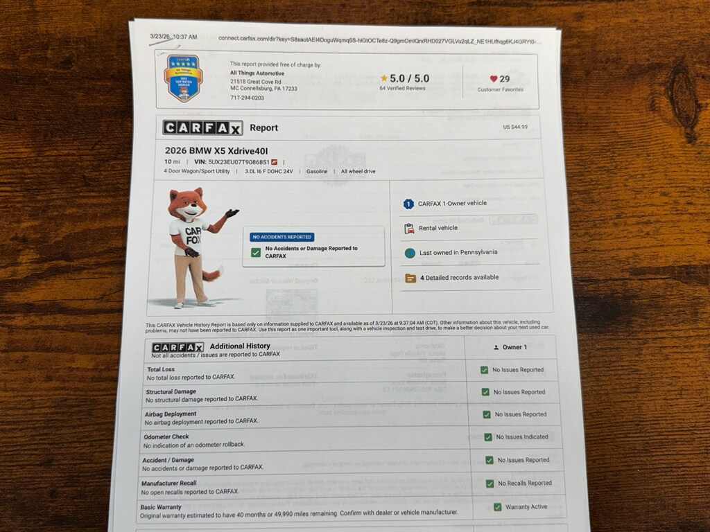 Discover exceptional value with this 2026 BMW X5 xDrive40i, located in McConnellsburg, PA. With just 13,222 miles, this AWD luxury SUV delivers powerful performance from its smooth 6-cylinder, 3.0L gasoline engine while maintaining low mileage that promises years of confident driving ahead. Carefully maintained and CARFAX certified with a single owner and a clean report, this BMW X5 offers peace of mind and a transparent vehicle history.