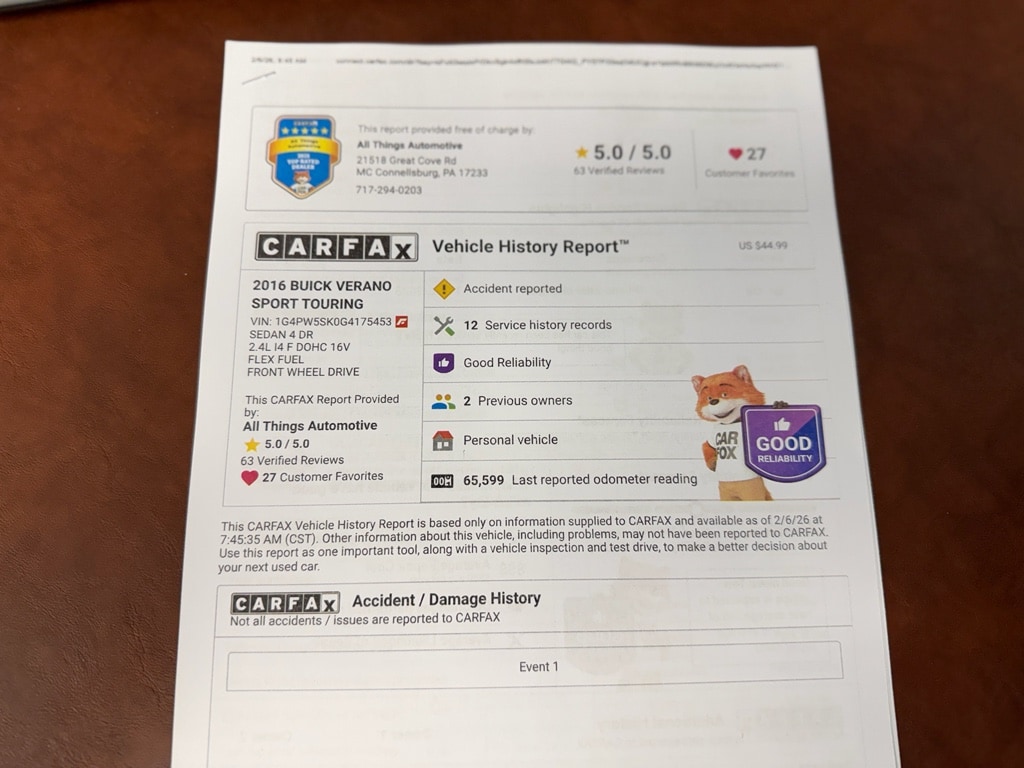 Discover exceptional value with this 2016 Buick Verano Sport Touringâ"now available in McConnellsburg, PA. This sleek compact luxury sedan pairs a fuel-efficient 2.4L 4-cylinder engine capable of running on Gasoline or E85 with smooth front-wheel drive dynamics for a confident, composed ride. Designed for comfort and technology, the Sport Touring trim brings premium features that enhance every drive.