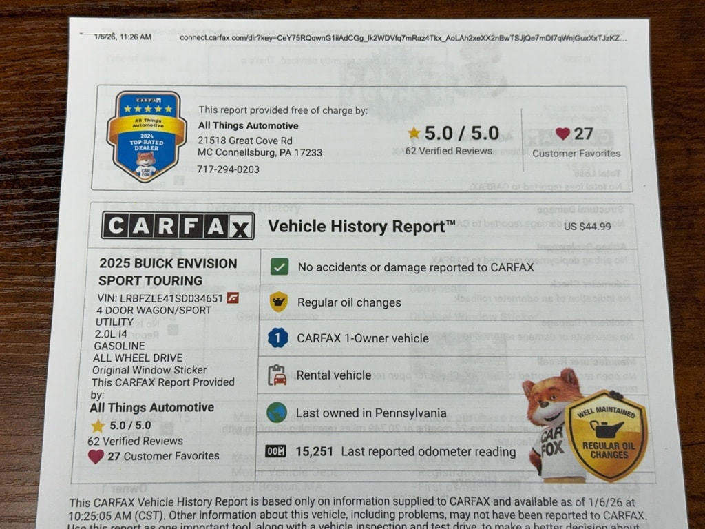 Explore exceptional value with this 2025 Buick Envision Sport Touring, located in McConnellsburg, PA â" the best price on a premium compact SUV with only 15,448 miles. This Sport Touring model pairs a fuel-efficient 4-cylinder 2.0L gasoline engine with smooth FWD performance, delivering confident daily driving and long-distance comfort without breaking the bank.