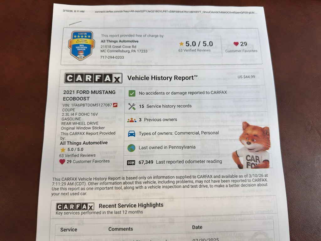 For sale in McConnellsburg, PA: a 2021 Ford Mustang EcoBoost that blends sporty performance with everyday practicality. Powered by a responsive 2.3L 4-cylinder engine and rear-wheel drive, this Ford Mustang delivers spirited acceleration and confident handling while maintaining strong fuel efficiency. Clean CARFAX report confirms a well-maintained history, giving you added peace of mind when buying pre-owned.