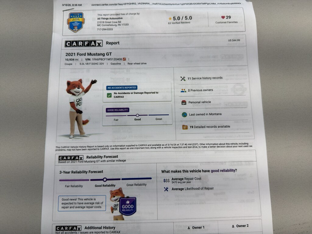Experience pure American performance with this 2021 Ford Mustang GT Premium in McConnellsburg, PA. With only 11,000 miles, this low-mileage V8 powerhouse is ready to deliver exhilarating drives and lasting value. Powered by a 5.0L V8 gasoline engine and rear-wheel drive, the Ford Mustang GT Premium blends raw muscle with refined features for everyday excitement.