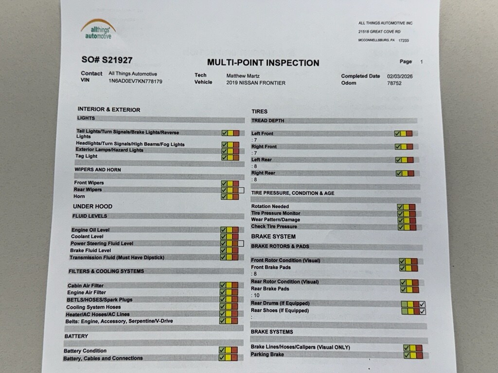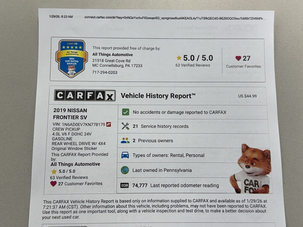 This well-equipped Nissan Frontier offers value for families, outdoor enthusiasts, and tradespeople who want a capable truck without paying top dollar. With its strong V6, versatile 4WD, modern features, and the best price in McConnellsburg, PA, this 2019 Nissan Frontier SV is a standout choice. Contact us today to schedule a test drive and see why this Nissan Frontier is the smart buy.