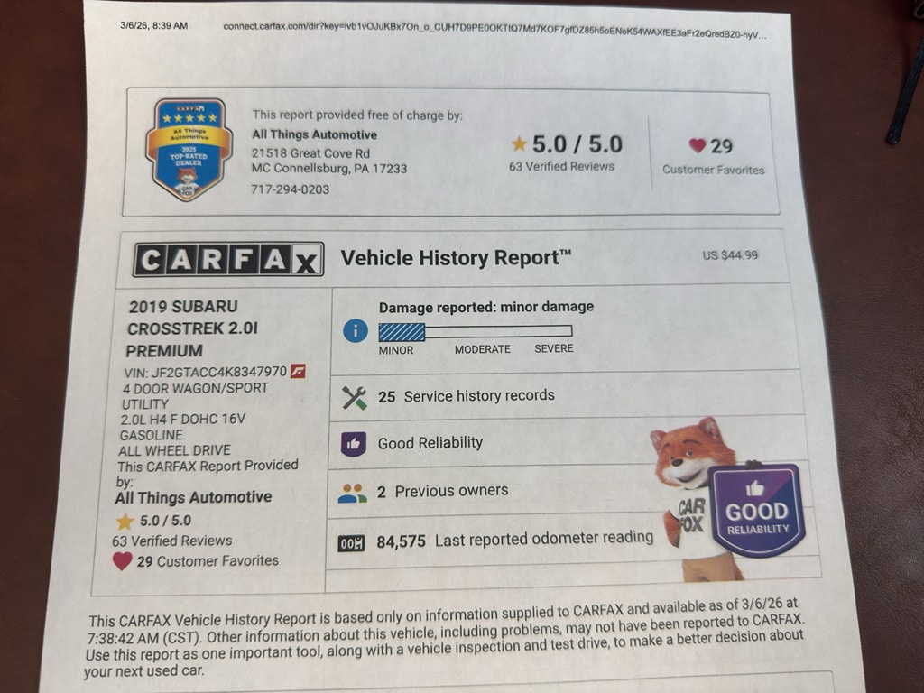 For sale in McConnellsburg, PA: 2019 Subaru Crosstrek Premium with AWD and a fuel-efficient 4-cylinder 2.0L gasoline engine. This versatile compact crossover combines Subaru's renowned Symmetrical All-Wheel Drive with confident handling, making it ideal for Pennsylvania roads and seasonal drives. The Premium trim adds comfort and convenience features you'll appreciate every day.