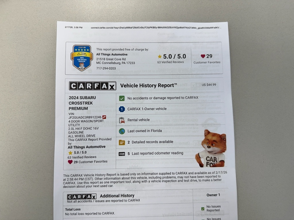 Low mileage and a 2024 model year mean you're getting a nearly-new crossover ready to tackle miles ahead without the new-car price. Located in McConnellsburg, PA, this Subaru Crosstrek Premium is priced to sell â" the best price you'll find for comparable models in the area. Whether commuting, running errands, or exploring off the beaten path, this Subaru Crosstrek offers a superb combination of economy, technology, and safety.